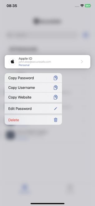 Diese einfache Liste ist äusserst leistungsfähig. Sie können nahezu alle alltäglichen Aktionen direkt von diesem Bildschirm aus durchführen. Klicken Sie dazu auf das 3-Punkte-Menü eines Passworts, um das Aktionsmenü zu öffnen.